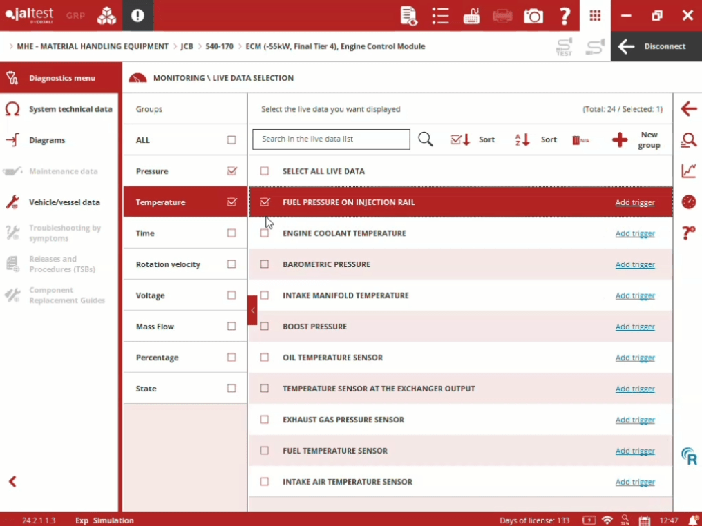 Une fonction essentielle du Jaltest JCB fault code finder est la surveillance des données en temps réel afin de savoir si tous les systèmes fonctionnent à leur niveau de performance optimal pour une productivité maximale. Obtenir des données en temps réel et les analyser constitue un moyen optimal d’anticiper toute défaillance potentielle et de prendre rapidement des mesures correctives si nécessaire.